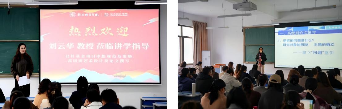 会议结束后,刘云华教授继续在河南开展系列学术讲座。她先后赴河南科技学院服装学院以及郑州经贸学院艺术设计学院进行关于国家社科基金项目申报与高级别艺术设计类论文撰写辅导,以及红帮服饰文化研究的专题讲座。讲座结合多年科研与教学经验,系统解读国家社科基金项目申报的规范要求、选题策略与论证要点,并围绕红帮传统服饰文化的历史渊源、工艺技法及其在当代设计教育中的创新实践进行深入讲解,为青年教师和研究人员提升科研与教学能力提供了有针对性的指导。